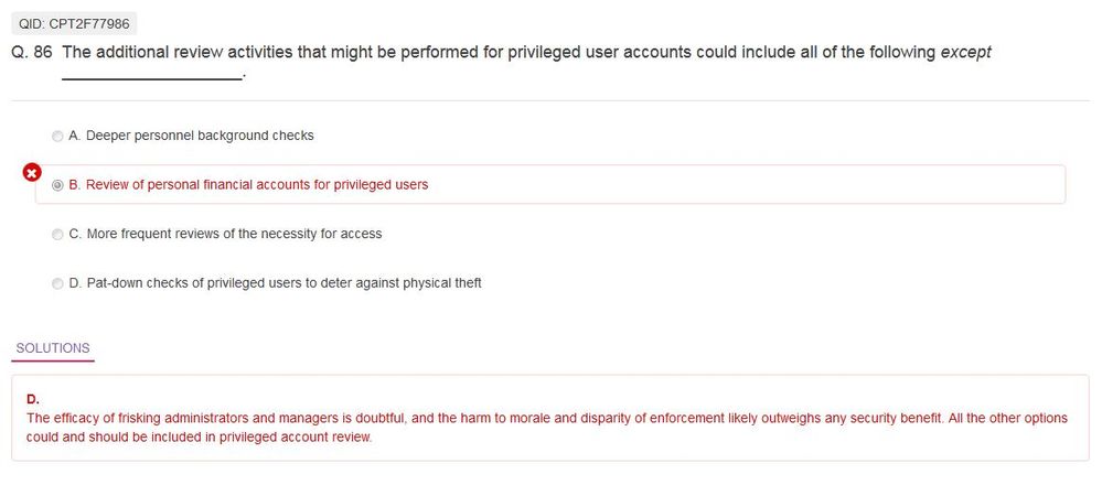 I have gone through Question 86 and I just want to confirm if this is the correct answer. I think it would not br appropriate to check the personal financial accounts of privilege users as that would be against data privacy. What do you think?