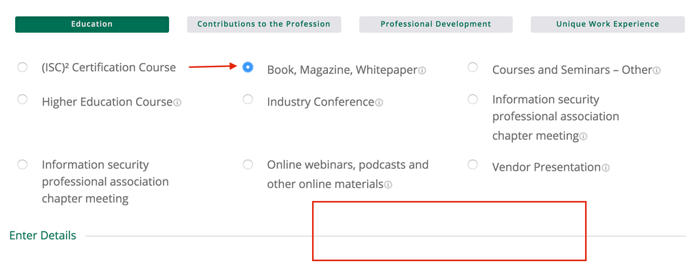 This problem is on not just the "Courses and Seminars - Others" but also "Book, Magazine, Whitepaper" category, I have checked all others within "Education", they have fields for "Enter details" and "Credits"