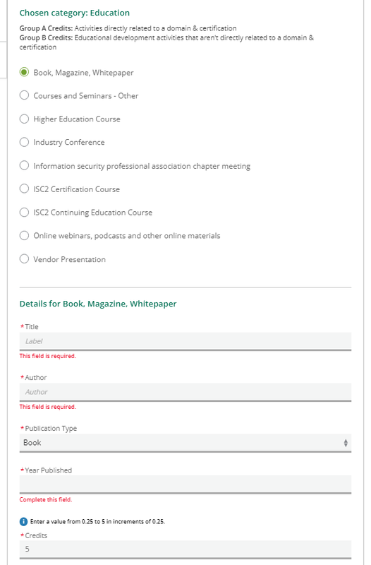 I found my workaround, however I believe this is a priority for ISC2 to fix since it impacts every member. Not sure if the field is disabled for every manual add - mine was book.
