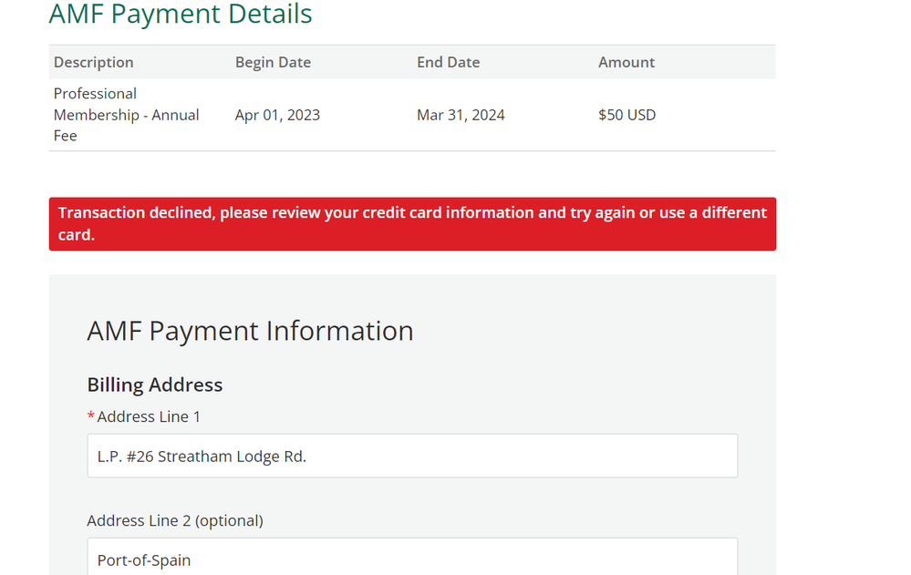 I'm having the same issue. Looking at this thread it seems to be a recurring problem over the last two years for ISC2. I contacted my bank when this occurred earlier and they had approved the transactions on their side. This has wasted my time this morning, taking credit card payments should not be so problematic. The red error notice that the transaction was declined (which is incorrect according to my bank) is not enough and should include directions to phone the ISC2 customer team. I shouldn't have to use a search engine to find a solution to this common problem on your community site. Surely taking money should be made easy if you want to retain members, I wonder how many have just given up in the past.